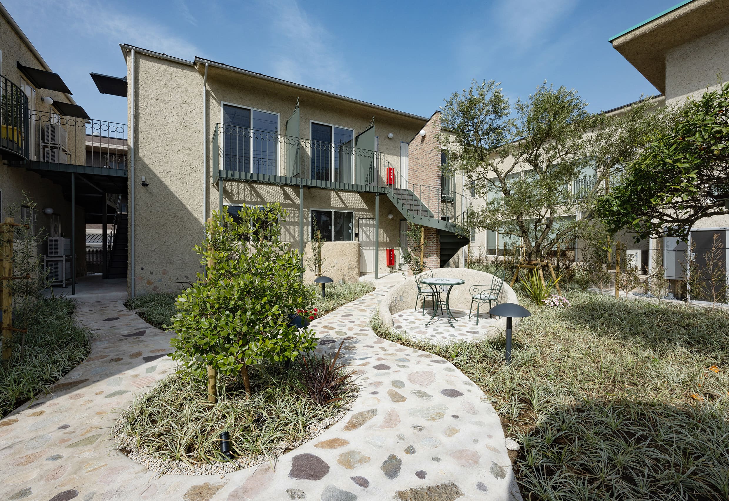 ヨーロッパ風の中庭アパルトメントは、賃貸住宅の常識が変わる今までにない発想の「満室アパルトメント」として話題に上がっている。西洋+和の外観だけでなく、各戸全てが中央の中庭に面し、入居者は自然豊かなその中庭を通る動線になっている。それにより、内外廊下を省き、ローコスト、賃料増。そして長期にわたって利回りを上げることができる。室内も自然素材など日本人の肌にあったデザインで、内外共に人と自然のコミュニケーションを図れる理想のアパルトメントとなっている。
